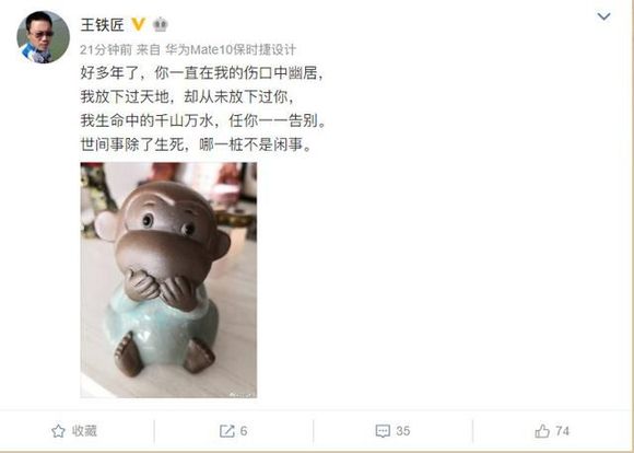 9月4日,王欣在微博表示,“好多年了,你一直在我的伤口中幽居,我放下过天地,却从未放下过你,我生命中的千山万水,任你一一告别。世间事除了生死,哪一桩不是闲事。 ”