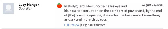 《卫报》:“在[贴身保镖]中,编剧默丘里奥将目光对准了腐败的权力中心,在剧集最后,他创造出又黑暗又吊人胃口的东西。”