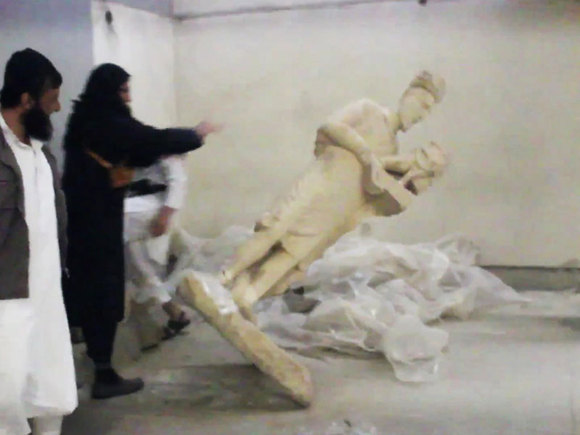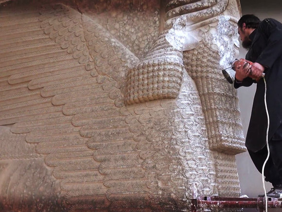 2月26日,ISIS发布的一段视频显示,ISIS武装分子挥动铁锤和电钻,砸毁具有上千年历史的古文物和雕像,将它们推倒在地。视频画面还显示,一名男子用电钻钻毁了亚述人的保护神“人首翼牛像”(Winged Bull),该雕像可追溯到公元前7世纪。他们还毁坏了冥神之门(Nirgal Gate)。亚述帝国首都尼尼微(Ninevah)曾有15座城门,冥神之门是其中之一。