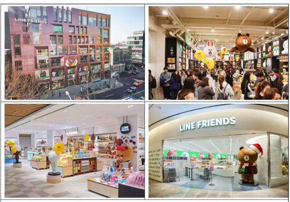 截至2017年年底,Line Friends在首尔、纽约、北京、东京等世界范围内各大城市共开设了超过78家的主题商店,表情角色相关衍生商品如文具、服饰、时尚杂货、玩具等种类达数千种。