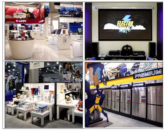 与普通的家电卖场相区别,ElectroMart还推出了超级英雄系列的“Electro Man”角色,并在Naver Webtoon上进行相关的漫画作品连载。此外围绕这一系列角色形象也有进行相关的衍生产品销售。