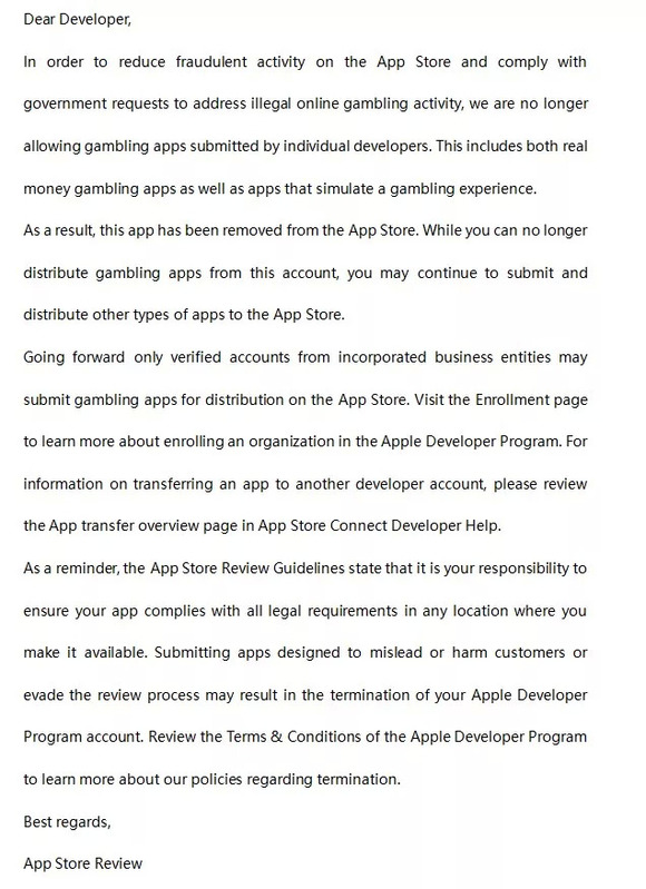 除了腾讯将“天天德州”退市,苹果也在8月初的时候开始整治App Store中存在的棋牌游戏,下架数量逾30000款,同时在给开发者的邮件中还提到“App Store以后将不再允许个人开发者上架赌博应用,包括真钱赌博和模拟赌博体验的个人开发者提交的应用在内都将不再被通过”。