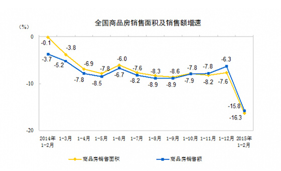 统计局的宏观数据显示,今年前两月全国商品房销售面积同比下降16.3%,商品房销售额同比下降15.8%,超过了去年12月6.3%的降幅。这个数据从去年开始就呈持续下降趋势,首次降息之后曾出现短暂回暖,但也仅持续了一个月的时间。尽管过去一年政府从限购松绑、降息等多个角度入手,但房地产市场的回暖目前看来仍动力不足。