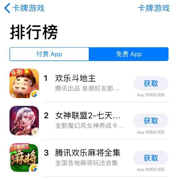 无论是对于手游市场还是对于腾讯游戏而言,棋牌游戏都是不可或缺的重要门类。截止发稿前,苹果商店app store卡牌类别游戏免费榜单前三名中,有两款是腾讯出品,分别为《欢乐斗地主》及《腾讯欢乐麻将全集》,同在这一榜单中,《天天德州》排在第35名。此外,有资料显示,在腾讯今年获得版号的 30 款游戏里,就有 7 款为棋牌游戏。