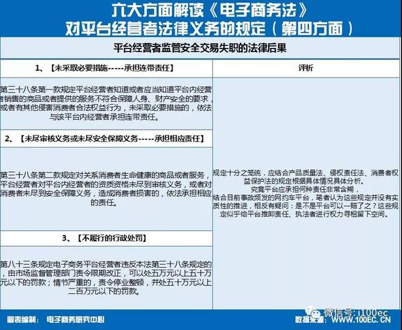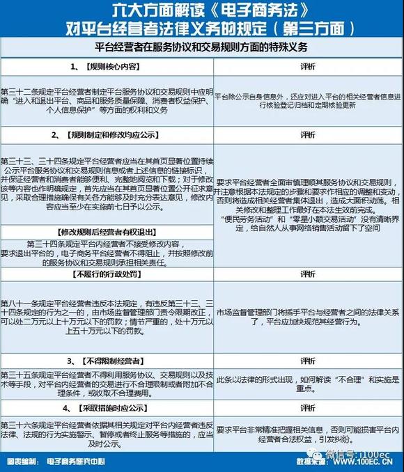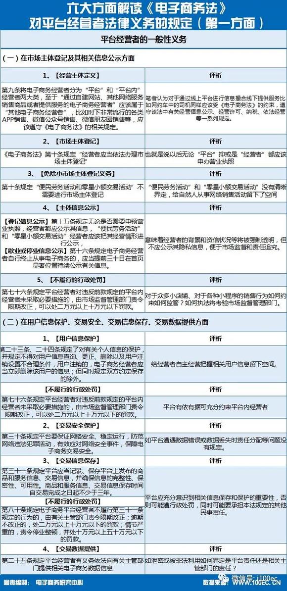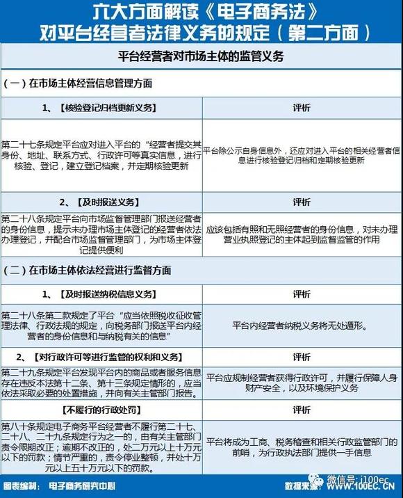 《电子商务法》作为我国电商领域首部综合性法律,引发业内极大关注。今后,保障电子商务各方主体的合法权益、规范电子商务行为有了一部专门法,这也是我国电商领域首部综合性法律。对此,国内知名电商智库——电子商务研究中心(微信ID:i100ec)组织业内法律专家发布系列电商快评,分别从跨境电商、平台经营者责任、微商、刷好评与删差评、个人网店征税等角度深度解读。(详见专题:http://www.100ec.cn/zt/draft/)。本文对平台经营者的法律义务进行解读。