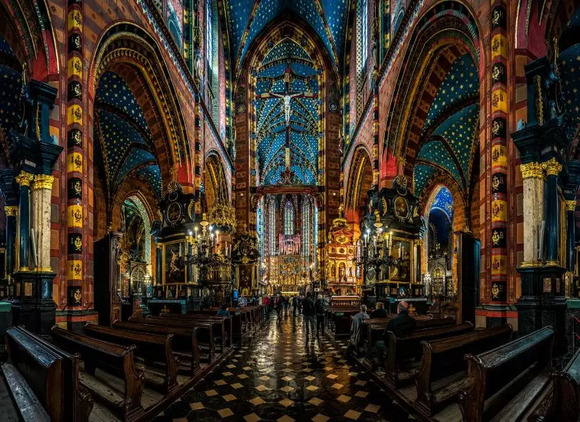 波兰人对宗教相当虔诚,波兰的宗教氛围十分浓郁,教堂也非常多。圣玛丽教堂就是一座砖砌哥特式天主教教堂,是市集广场上最瞩目的建筑,也是克拉科夫的地标性建筑。每隔1小时,教堂最高处的瞭望塔还会演奏军号。