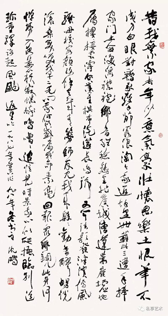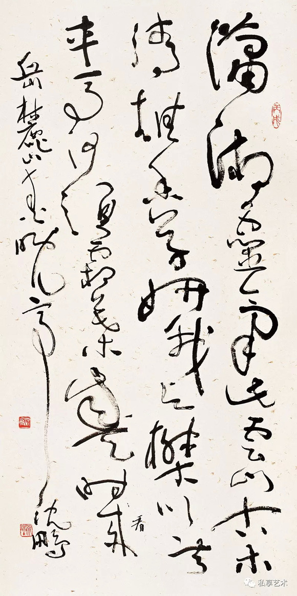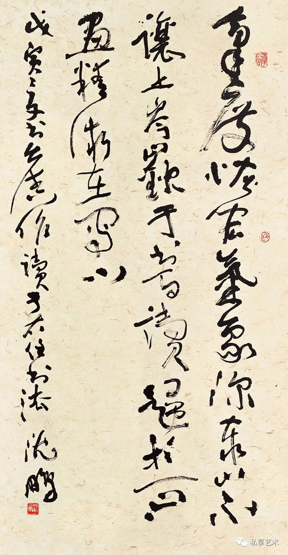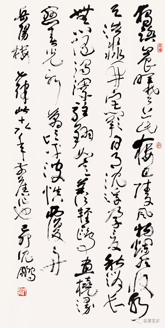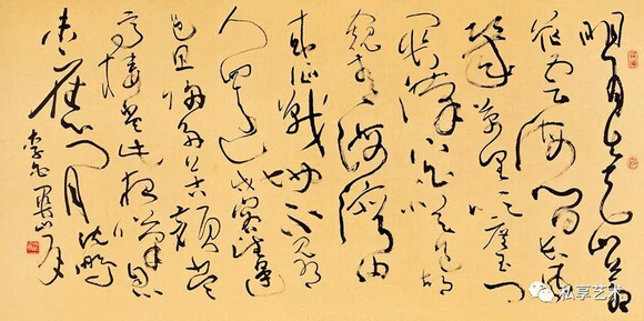 当前写草书者颇不乏人,而进入狂草者甚少。我们时代充满着快速的节奏,呼唤着昂扬进取的精神,也决不排除视觉的刺激性。可是相比之下,狂草的凤毛麟角令人遗憾。这首先是狂草书法难以理解,接受者少。对书写者来说,学习的难度大,不仅写好楷书、行书不足以尽狂草的基本功,而且甚至写好一般草书要进入狂草也还要有一个质变的过程。