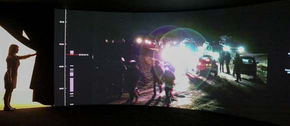 在“法医建筑”(Forensic Architecture)的作品里,暴力场面不断地爆发并被分析。你一进门就闯入了一个充满闪光和枪声、警车、跺脚、叫喊和不断响起的汽车喇叭的战场。所有这些都在弯曲的黑色屏幕上投射和放大。真实的镜头和电脑建模,对混乱情形的仔细分析和重建,使官方记录成为了谎言:数百名以色列警察突袭了一个贝都因村庄,摧毁了一些房屋并杀害了一名村民。一名纪录片拍摄者在现场,他拍摄了95个视频,但是在事件的密集发生中,他搞不懂到底发生了什么。无论是在《瞬间的漫长持续》(The Long Duration of a Split Second)这个数字作品里,还是在影像外的整个空间里,艺术小组通过电影、文本、照片和模型重建事件和时间线,呈现出了一个赤裸裸的世界。
