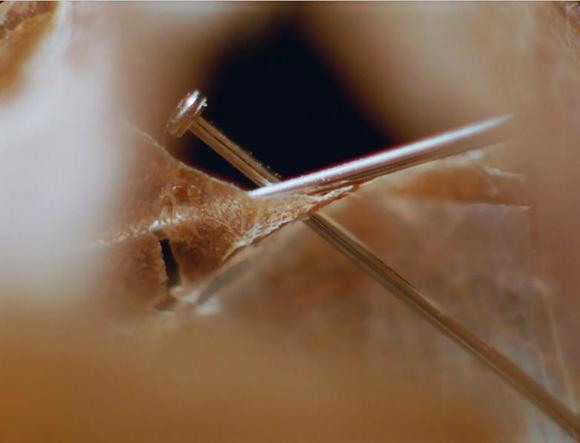 在最后的彩色影像中,汤普森仔细观察了已故英国艺术家唐纳德·罗德尼(Donald Rodney)的小雕塑,这是他在患镰状细胞贫血症时,把自己脱落的皮肤用缝纫针固定起来做成的。这座雕塑是房子的形状。这个小物件既抽象又坚实,易碎,半透明,模糊不清,就在我们面前转动。我们在“墙壁”上看到人体组织,像条纹大理石一样发光。