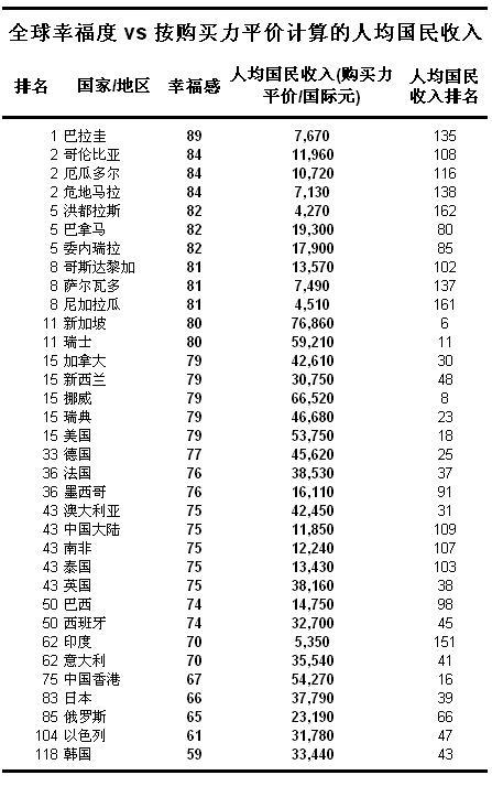 根据世界银行统计汇编的2013年数据,按购买力平价计算,人均国民收入排名全球第135位的巴拉圭,其国民却拥有最多的幸福;排名第138位的危地马拉,也在人民幸福度排名中名列全球第二。