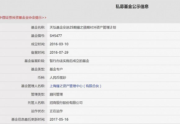 基金业协会的公示信息显示,上述基金为“顾问管理”,实际管理人为上海耀之,后者为私募证券投资基金管理人。