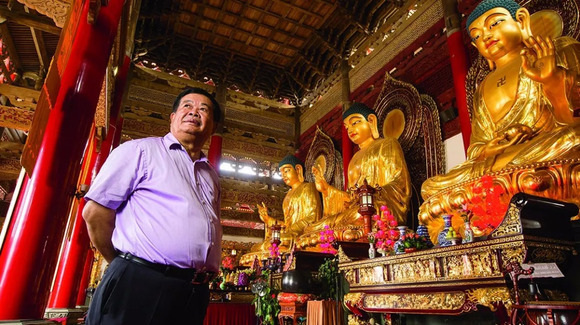 ▲ 曹德旺在他捐资修建的崇恩禅寺大雄宝殿内。佛教六度之忍辱、布施、精进、持戒、般若、禅定,也是这位“玻璃大王”的人生信条