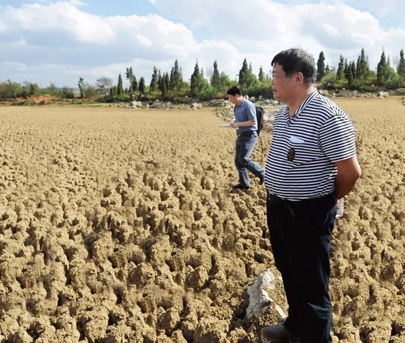 ▲ 2010 年 5 月,曹德旺在云南省陆良县天生坝水库考察旱情,干涸的土地已经完全龟裂。这一年,他为旱情严重的西南五省市捐款 2 亿元,该项捐款惠及 10 万户受灾家庭