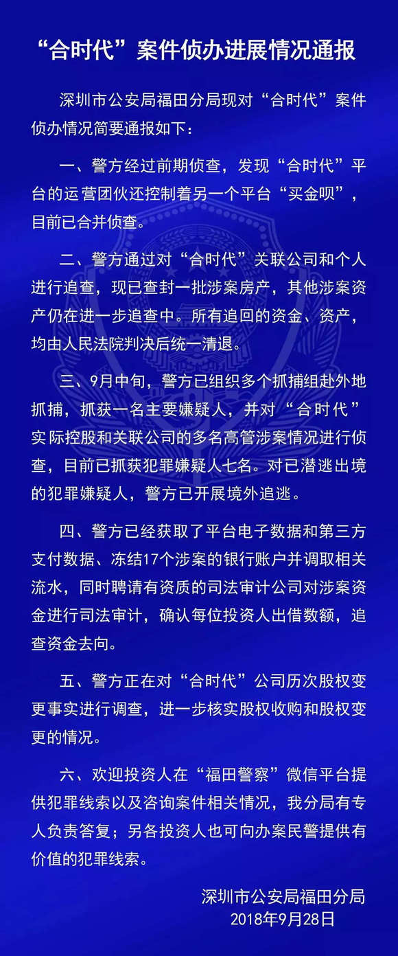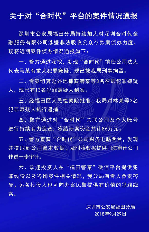 9月29日,福田公安再次对“合时代”的最新案情进行了通报,9月30日,深圳金融办通报称,已潜逃境外2个多月的“合时代”平台案件犯罪嫌疑人孟某回国投案自首。