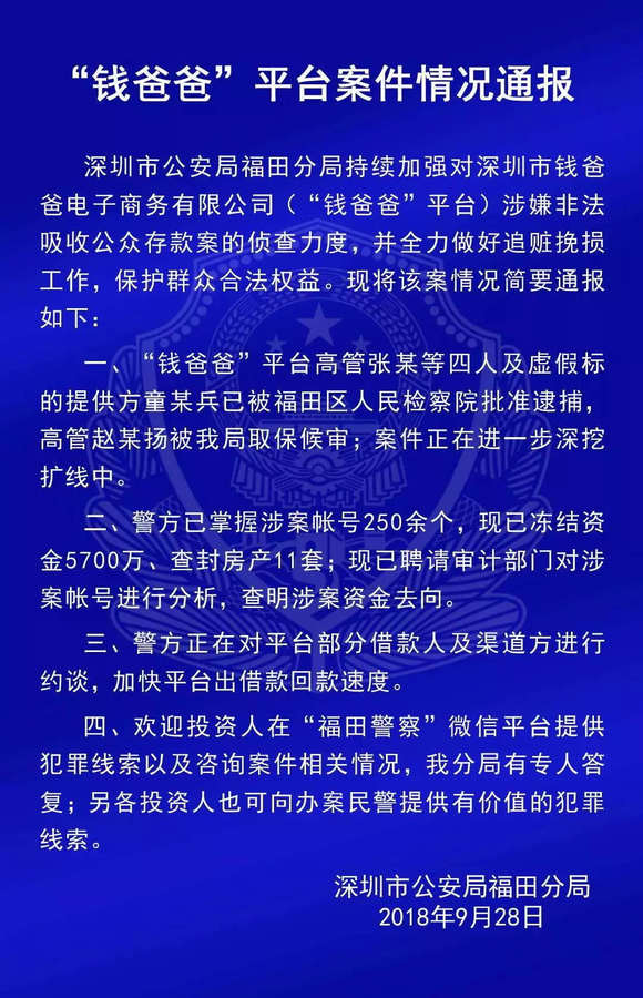 9月28日,深圳市公安局福田分局通过官方微信发布了多起P2P案件最新调查进展情况。