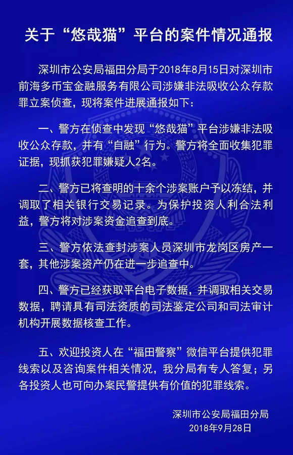 1、在侦查过程中,警方发现“悠哉猫”不仅涉嫌非法吸收公众存款,并有“自融”行为。警方将全面收集犯罪证据,现已抓获犯罪嫌疑人2名。