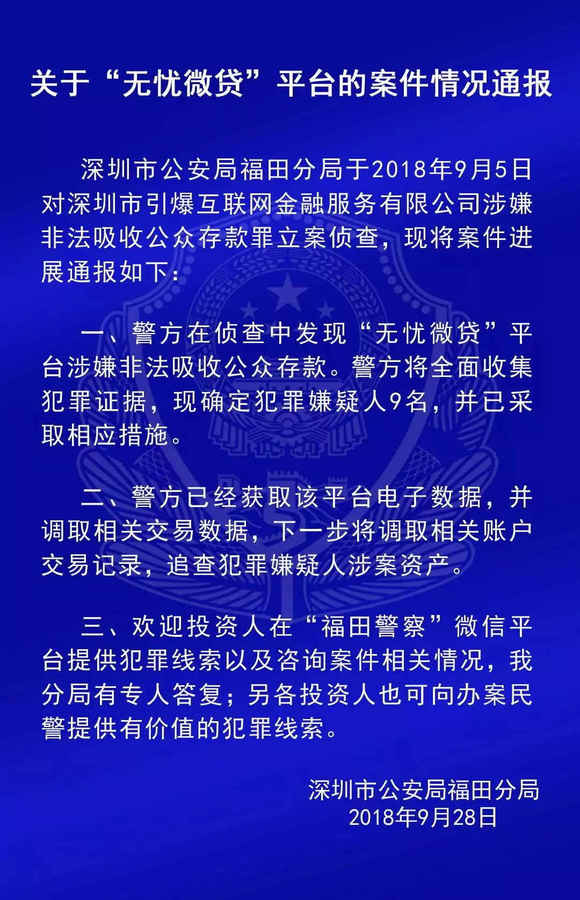 1、“无忧微贷”平台因涉嫌非法吸收公众存款,福田警方已于9月5日对其立案侦查,现确定犯罪嫌疑人9名,并已采取相应措施。