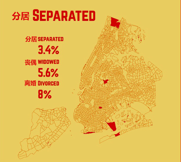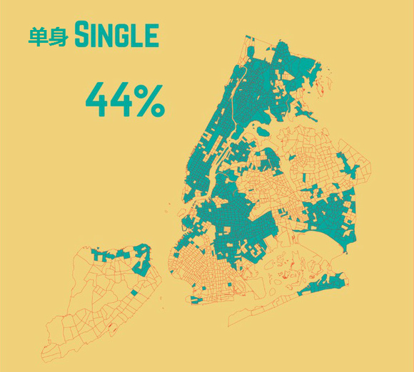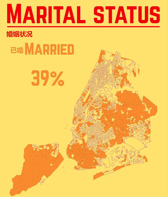这三张图从上至下依次是已婚人士(39%)、单身人士(44%分布)及其他(分居人士3.4%;丧偶5.6%;离婚人士8%)的分布。如果你已婚,你最有可能住在斯塔滕岛。曼哈顿则多是单身人士。