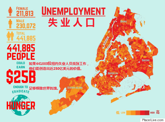 纽约全市失业人口中有211813名女性、230072名男性。PlaceILive.com使用美国人口普查数据计算发现,如果这441885名纽约失业人员找到工作,他们能创造出近250亿美元的价值,足够根除世界饥饿。