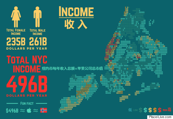 据美国人口普查数据,纽约人每年总收入为4960亿美元,约等于苹果公司总市值。其中女士收入2350亿美元,男士为2610亿美元。