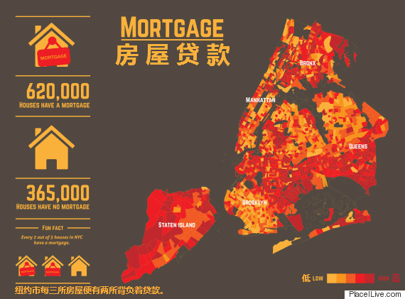 纽约外环地区房屋抵押贷款程度较高。全纽约市有62万所房屋有抵押贷款,36.5万所无贷。换言之,纽约市每三所房屋便有两所背负着贷款。
