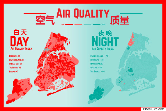根据Breezometer的数据,布鲁克林区和斯塔滕岛的一些地方白天空气质量最低。