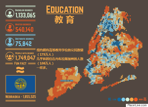 据美国人口普查数据,纽约拥有高等教育学位的公民数量(175万人)几乎和居住在内布拉斯加州的人数(186万人)一样多。其中有113万人拥有本科学位,54万人读完了研究生,7.5万人获得了博士学位。
