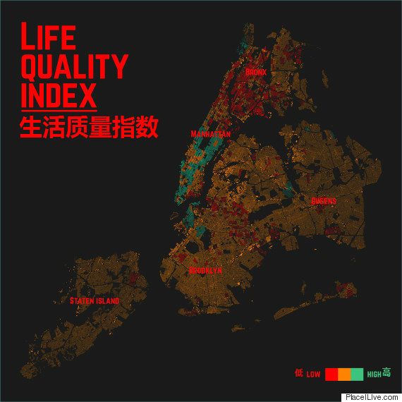 地图根据PlaceILive.com采用100多个数据源计算的生活质量指数绘制而成。可以明显看出曼哈顿是最高的。