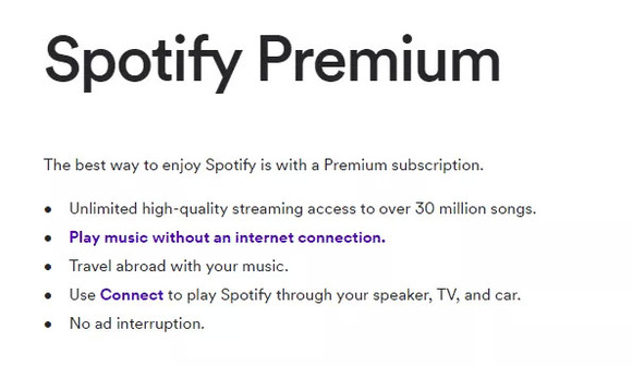 Spotify Premium是它主流的付费订阅服务,售价为每月9.99美元。用户可以按需播放任何类型的歌曲,搜索新音乐,搜索和收藏播放列表,分享音乐和播放列表,收听Spotify的广播功能选择的曲目,以及创建和编辑播放列表。用户还能享受到高码率(320 kbps)的音乐并且把自己喜欢的音乐下载缓存。当然,这个版本没有广告。