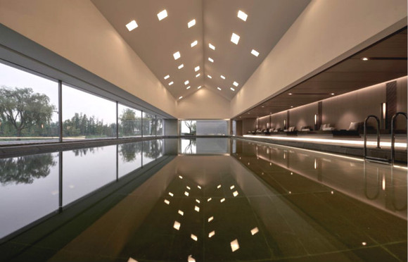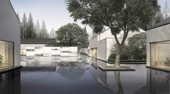 据悉,设计师用景观水池和一些极简建筑,打造出了一种现代版小桥流水人家的意境,在典型的江南建筑基础上大胆运用几何化和抽象化的设计,给了这座江南水乡一点现代化的都市感。