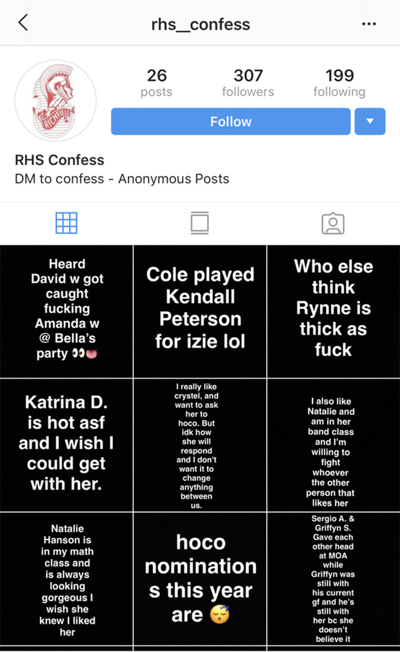 很多高中会运行匿名的“树洞”式Instagram账户,只要是这个学校里学生的八卦,都可以发到这个账户来。以“格林威尔公立高中树洞”这个账户为例,它的简介是让粉丝“上茶”,也就是让他们发八卦消息。学校的学生会关注这个私密账户,然后把别人说人坏话的信息发过去,或是发些学校里的流言蜚语。这个账户的管理员会从中选出最有料的内容发在动态故事里,或是直接在主页发帖,有时候甚至会直接在帖子里标记当事人的名字。