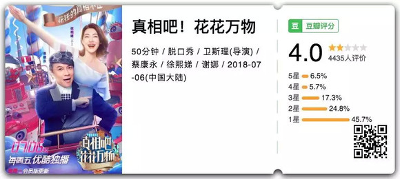当年[康熙]扣除两位主持人酬劳,单集制作费是50万元台币(10万人民币),而这次[花花万物]单集制作费则是5000万元台币(1000万人民币),相差一百倍的金额,却换来更尴尬且糟糕的效果。