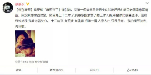 以蔡康永为代表的台湾艺人纷纷北上,演艺圈人才严重流失,老艺人出走,新人却撑不起接棒重担,台湾综艺人才出现断层;再加上台湾电视台将投资耗费在买进内地节目(当年的[中国好声音],[爸爸去哪儿]等等),却不肯为[康熙]增加预算,使得节目很难实现更复杂的创意,限制了节目的发展……