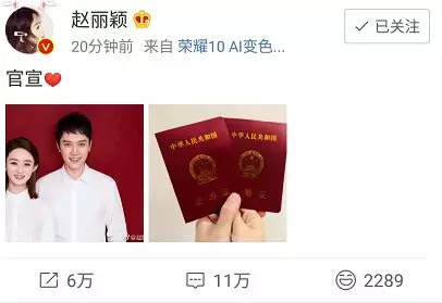 10月16日10点07分,赵丽颖在31岁生日当天在微博上发布了与冯绍峰结婚证,配文“官宣[心]”正式宣布结婚喜讯。官宣时间10月16日10点07分中,10月16日是赵丽颖的生日,10点07分则是冯绍峰的生日10月07日,小细节见得真心意。