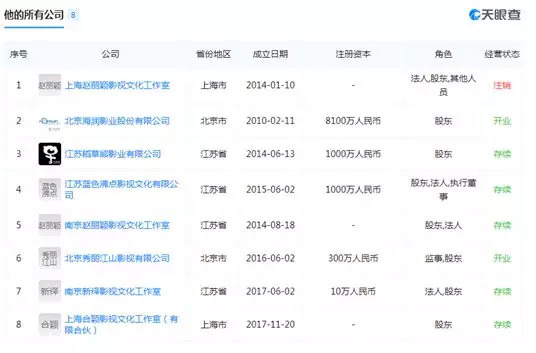 据天眼查数据,赵丽颖与8家公司有密切关系,除已经注销的上海赵丽颖影视文化工作室外,另担任了江苏蓝色沸点影视文化有限公司(投资比例49%)、南京赵丽颖影视文化工作室(个人独资)、南京新绎影视文化工作室(个人独资)三家企业的法人代表。同时是北京海润影业股份有限公司(投资比例1.77%)、江苏稻草熊影业有限公司(投资比例1%)、北京秀丽江山影视有限公司(投资比例60%)、上海合颖影视文化工作室(有限合伙)4家公司的股东。
