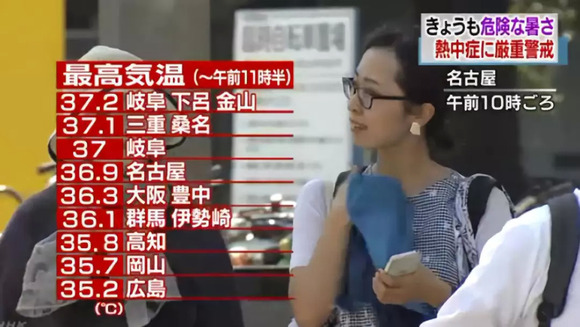 比如中国、韩国,连续20多天发布高温预警。日本更遭受前所未有的热浪袭击,造成50,000人被送医,300人被热死,一周内有65人死亡!