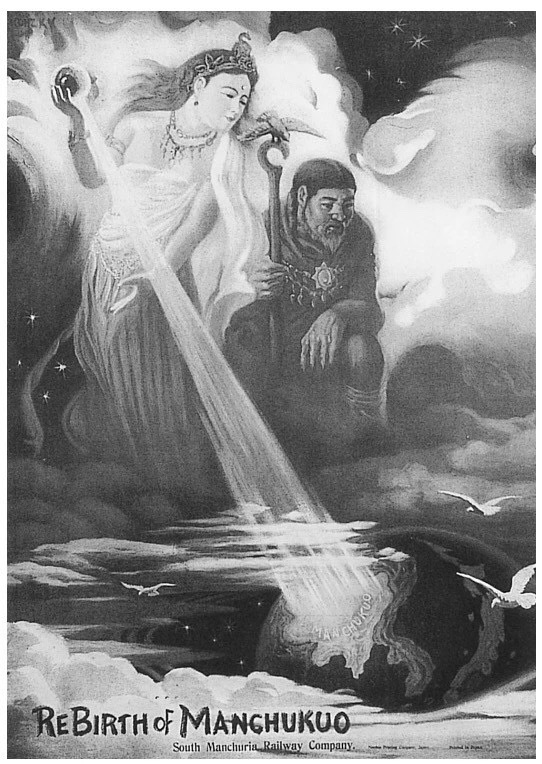 除了墙上的油画外,“满洲馆”内正中还摆放着一个立体沙盘,涵盖了从朝鲜半岛到中国东北的广大地域。城市、村镇、铁路、港口以及主要工业地都用灯光来显示。朝鲜半岛和中国东北,包括热河在内的区域,“灯光璀璨,群星闪耀”,暗示着日本为该地区所带来的巨大经济变化。与此形成鲜明对比的是,中国长城以南、蒙古和苏联等周边区域一片黑暗和死寂。此外,朝鲜与中国之间没有边界,热河被包含在伪满洲国境内,其中的含义不言而喻。