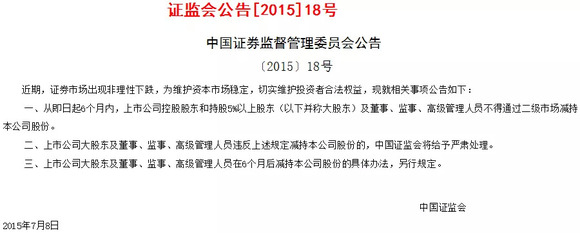 2015年下半年股灾爆发,当时为了救市,证监会临时发布《18号文》,禁止上市公司大股东减持股票,试图通过这一措施来维稳股市。