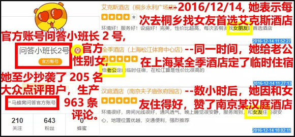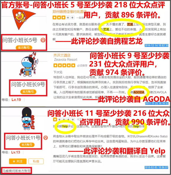 如上图所示,我们发现马蜂窝官方账号——问答小班长1-11号以及其它一些发布官方信息的账号人均抄袭了数百位不同大众点评网友以及大量其它竞品与行业巨头的用户内容。