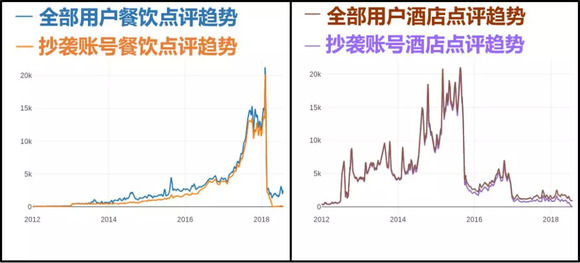 不考虑从他人点评里截取中间段落或者拼接不同用户内容等“抄袭升级”现象,也忽略旅游产品、景点、娱乐等版块中的侵权行为,单单这七千余抄袭账号在餐饮、酒店两部分就生产了近1800万条点评,以不到马蜂窝1.2亿用户万分之一的体量贡献了总数85%以上的评价内容。(后文以"抄袭帐号"、"抄袭团 伙"代指这7454例抄袭账号)