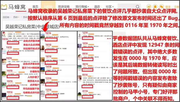 值得一提的是,时间戳为"0000"年的点评内容发布者除了经典抄袭账号,都是疑似由商家控制的马甲小号,内容很少且专门集中好评那批商户…… 个中细节容后再表,至此我们基本可以推断马蜂窝的巨量抄袭侵权行为与官方账号有极强的关联。