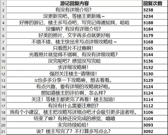 我们从近160万篇游记中发现了抄袭账号上千种诸如“真羡慕楼主能去这里玩呀”、“看完内心波动了一下哈哈”等内容重复、针对游记发布者的回复,而收到这些留言的游记作者对真相并不知情,甚至还会尝试回应抄袭账号,只有少量细心用户发现了蹊跷: