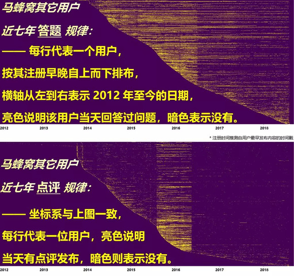 以上两幅热力图描绘了马蜂窝非抄袭账号中最活跃的一万五千名用户的活动轨迹,每一行代表一名用户,按注册早晚至上而下排列。横轴从左到右代表 2012年至今的日期。每一行的明暗变化表示了一位用户的答题或点评作息规律——亮色说明该账号在横坐标对应日期有内容发布,暗色意味着该用户当天没有活动。可以看出用户们的发布规律十分统一,甚至产生了黄金分割一般妖异的美感…… 那么其它非抄袭账号是如何表现的呢?