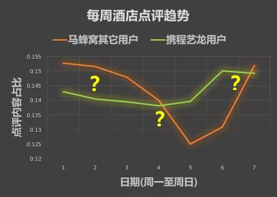 可以看出,马蜂窝上所有非抄袭账号即“普通用户”发布餐饮点评的作息习惯都与大众点评网网友大相径庭,每天、每周创作周期的高峰和低谷都很不同。那么酒店点评呢?