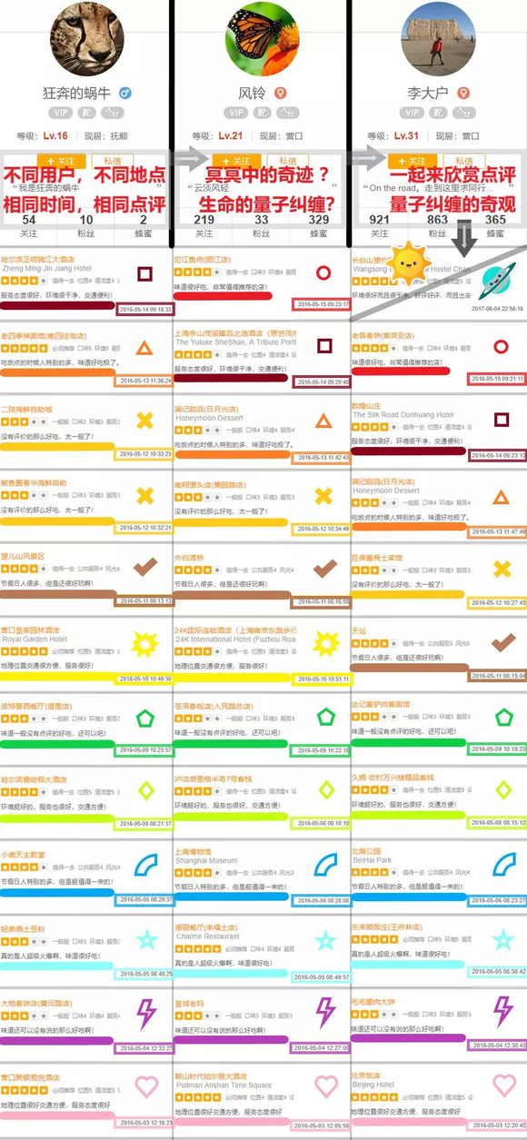 不得不说,种种差异颇为令人玩味。此外,非抄袭账号中还存在多名用户在同一时间以同样内容评论不同POI的奇异现象,可谓用户内容之量子纠缠: