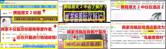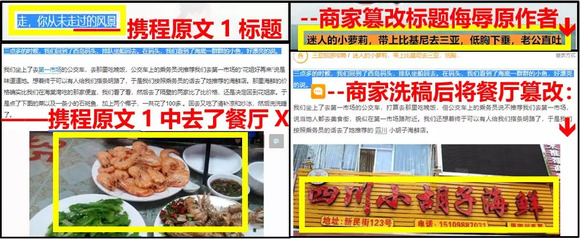 还有很多内容主干抄袭自其他站点和用户的游记,正文中被篡改和插入了关于这批商家的消费内容,导致网络上时常出现许多篇同样的游记,里面同样的主角却在同样的时间地点吃了不同的餐厅,有的商家甚至在洗稿标题中侮辱原作者以博人眼球。