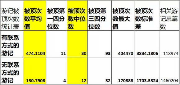 尽管马蜂窝禁止未经允许发布广告内容(13),甚至普通用户留下联系方式都可能遭致删帖(14),但这些商家似乎会针对平台算法进行内容优化。我们分析了493,487位用户的1,579,178篇游记,约7%的游记虽然含有各种各样的商家联系方式,被顶贴数量却远远超过其他游记。