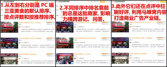 除了游记、问答,做号控评商户在点评内容中同样极尽钻营之能事。以三亚为例,如果用户在网页端按目的地浏览美食,不论选哪种排序方式,最先映入眼帘的都是这些心机商家旗下的餐厅,平均点评内容可多达上万条且绝大部分均为5星好评。