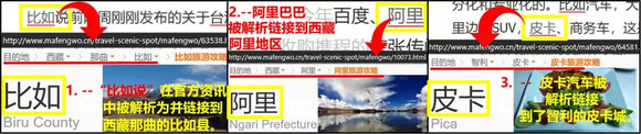 或许马蜂窝日常经营之余应该对技术研发投入更多精力。且不谈抄袭等问题,访客随意点开马蜂窝资讯页的官方内容,就能看到“比如说”、“售卖通道”、“繁荣昌盛”、“SUV皮卡”、“阿里腾讯”、“创新和产品”等常见短语子字符串被当作POI处理的现象。
