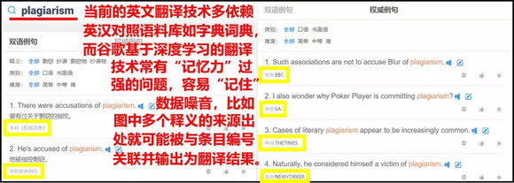基于深度学习的谷歌翻译技术经常会出现记忆力过强的问题(有些时候甚至能够记忆训练数据中诸如银行卡号码等敏感信息25),导致其不断重复训练数据噪音,而词典中对多个来源释义结果常常会如上图所示分别注明出处,因此在遇到原文中有多条目标注时就很可能将训练数据里中的注释内容反馈到结果中。